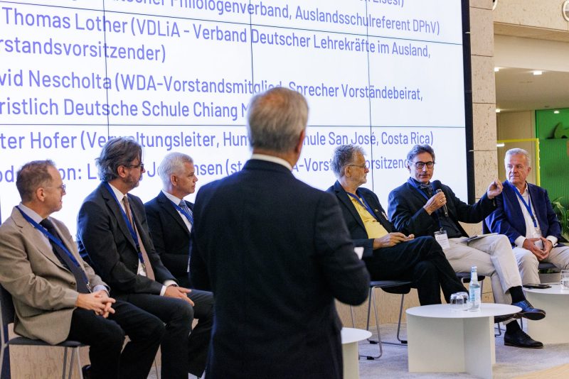 Vertreterinnen und Vertreter aus Mitgliedsschulen, Politik, fördernden Stellen, Wirtschaft, Wissenschaft und Verbänden haben gemeinsam diskutiert, wie die Deutschen Auslandsschulen weltweit gestärkt werden können Auf dem Podium Allianz – Berliner Erklärung Teil 1, waren neben Dr. Thomas Lother, Vorstandsvorsitzender VDLiA – Verband Deutscher Lehrkräfte im Ausland noch Wilfried Auel, Vorstand der AGAL, GEW – Arbeitsgruppe Auslandslehrerinnen und Auslandslehrer (AGAL); Rolf Knieling, Auslandsschulreferent DPhV, Ministerialrat a.D.; Deutscher Philologenverband; David Nescholta, Sprecher des Vorständebeirats, Christliche Deutsche Schule Chiang Mai, WDA-Vorstandsmitglied; Thomas Frey, Schulleiter / Schulleitungsbeirat Istanbul Erkek Lisesi sowie Peter Hofer, Verwaltungsleiter der Deutschen Schule San José vertreten. Die Moderation übernahm Ludwig Johannsen, stellv. Vorsitzender des Weltverbandes der Deutschen Auslandsschulen.